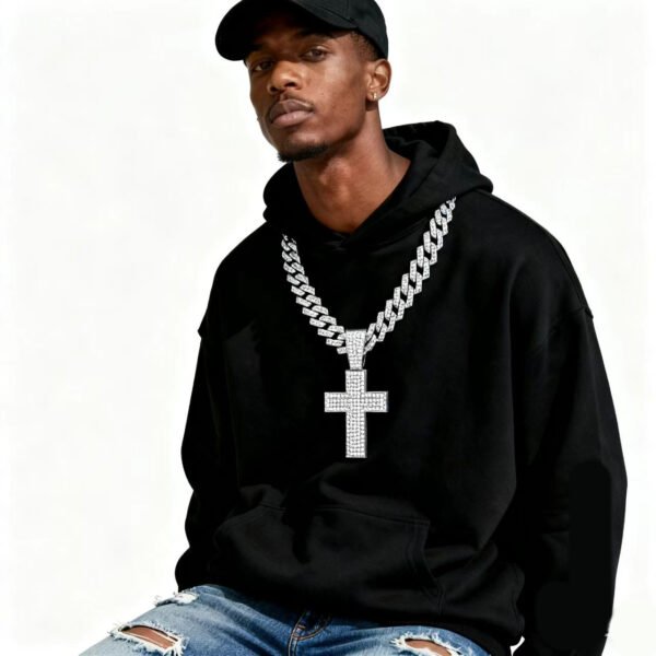 Express bold faith and fearless style with this Hip-Hop Rhinestone Alloy Cross Pendant Cuban Link Necklace, designed for men who love luxury streetwear and standout statement jewelry.