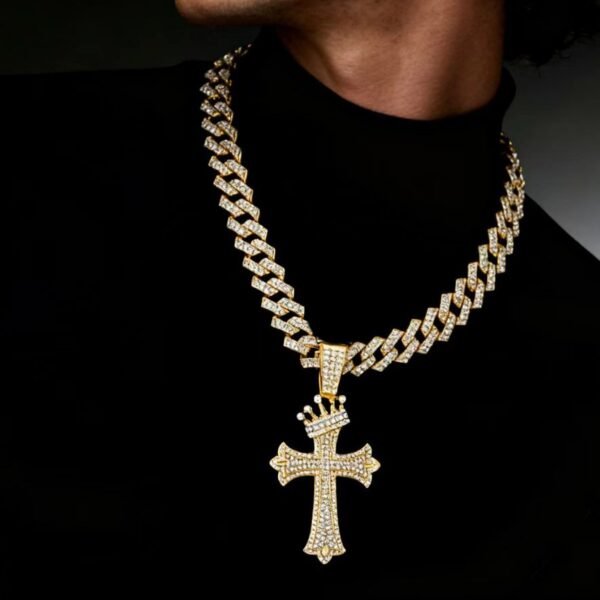 Show your power and faith with this Hip-Hop Full-Rhinestone Crown & Cross Pendant Cuban Link Necklace, designed for men who love bold luxury and statement streetwear style.