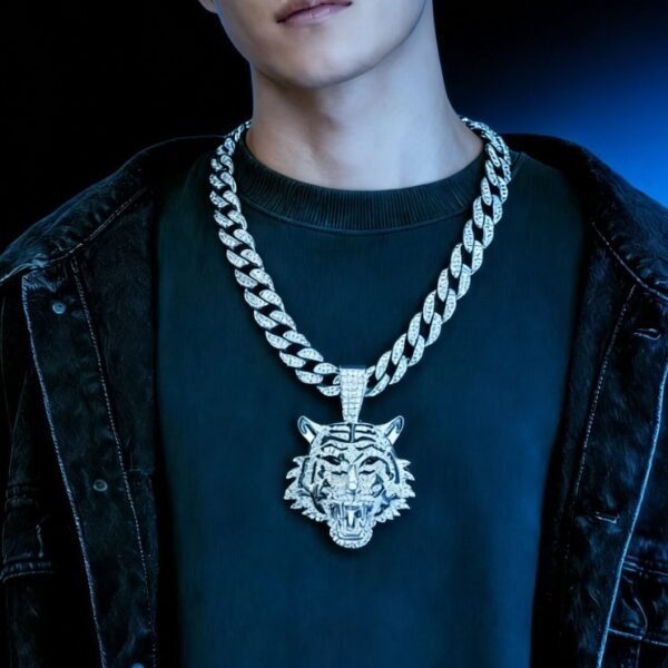 - Eye-catching tiger pendant with sparkling rhinestone details for a strong hip-hop statement
