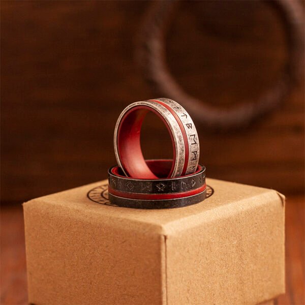 A bold Nordic Viking ring featuring striking red accents, symbolizing strength, courage, and warrior spirit.