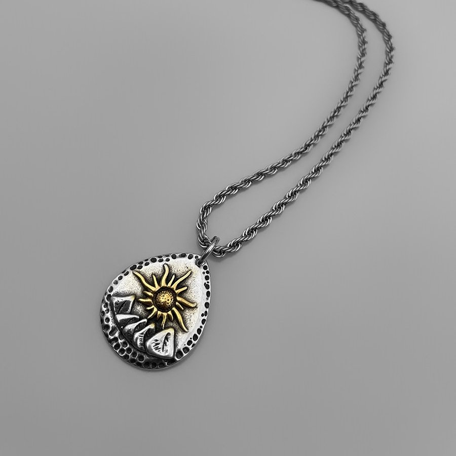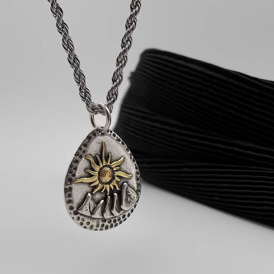 Inspired by the harmony of nature, this dual-sided pendant combines the powerful imagery of the sun and mountains into one meaningful design. The sun represents energy, direction, and life, while the mountains symbolize strength, stability, and the journey forward. Together, they create a piece that reflects balance, resilience, and a spirit of exploration.