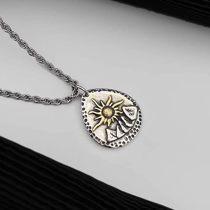 A vintage dual-sided pendant featuring the sun and mountains — a symbol of balance, journey, and inner strength.