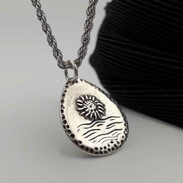 Crafted from durable alloy with a vintage finish, this necklace carries a rugged, worn-in character that feels both timeless and authentic. The dual-sided design adds depth and versatility, allowing you to switch up your look depending on your style or mood. Whether worn as a personal symbol or a bold accessory, it brings a grounded yet adventurous edge to any outfit.