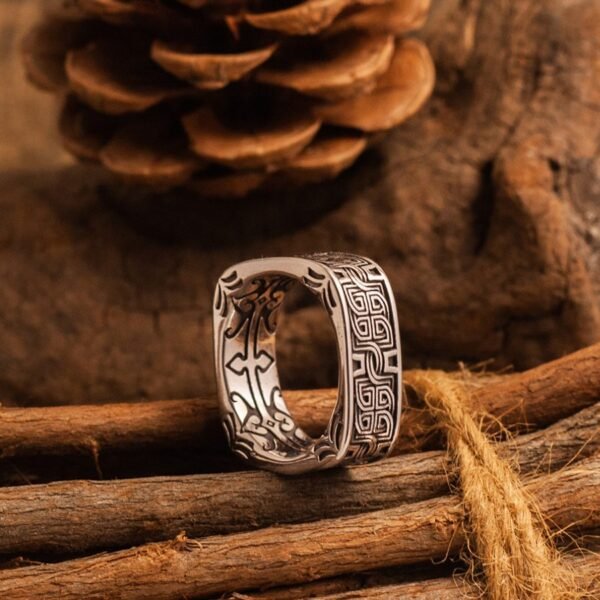 A bold Celtic knot square ring symbolizing eternity, strength, and timeless masculine style.
